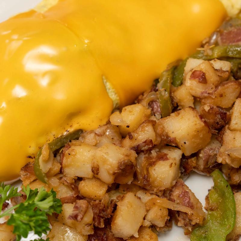 Made with 3 farm-fresh eggs, served with hash browns or country potatoes and your choice of toast: white, wheat, or sourdough. Egg white substitute available.